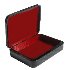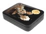 The box is constructed from paper-mache. Black lacquer is used to paint the exterior of the box while red lacquer completes the interior of the work. A hinge is fastened to the left of the composition, and the box rests flat.