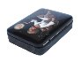 The box is constructed from paper-mache. Black lacquer is used to paint the exterior of the box while red lacquer completes the interior of the work. A hinge is fastened to the left of the composition, and the box rests flat.