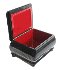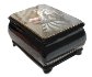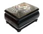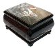 The box is constructed from paper-mache. Black lacquer is used to paint the exterior of the box while red lacquer completes the interior of the work. A hinge is fastened to the left of the portrait, and the box rests on a flat bottom. The work is signed with the artist's name.