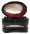 The box is constructed from paper-mache and mother-of-pearl. Black lacquer is used to paint the exterior of the piece while deep red lacquer completes the interior of the box. A hinge is fastened to the top of the composition, and the box rests on the platform, that goes around the edge of the base. The work is signed with the artist's name at the bottom of the composition.
