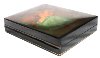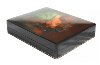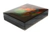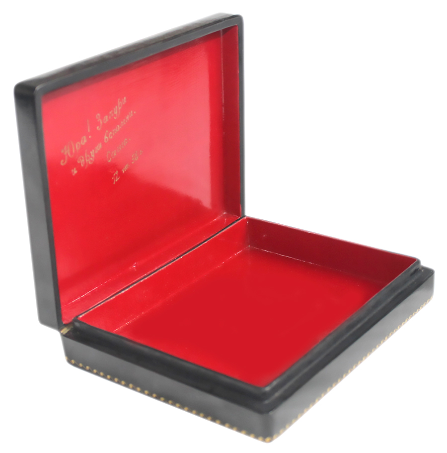 The box is constructed of paper-mache. Black lacquer covers the exterior and red lacquer covers the interior of the box. The box has a hinge from the left of the painting, and rests flat.