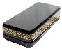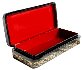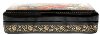 The box is constructed from paper-mache. Black lacquer is used to paint the exterior of the box while red lacquer completes the interior of the piece.