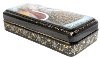 The box shows Snowmaiden strolling in the Winter forest and feeding a bird. The palette incorporates blue and white oils as the action takes place in winter, with addition of gold and silver metal paints to give a feeling of magic and splendor.br The artist demonstrates his unsurpassed skill while painting the Snowmaiden's festive attire. Painting with an ultra fine brush, she creates exquisite gold lace texture of her fur coat, stand-up collar and crown. The effect of festivity is strengthened by a piece of mother-of-pear inlaid into her costume; it shimmers beautifully with bright green and blue tints. Another piece of mother-of-pear is shining through the beautiful hat-set (cocoshnik).