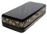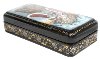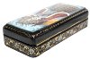 The box is constructed from paper-mache. Black lacquer is used to paint the exterior of the piece while red lacquer completes the interior of the work. The lid is hinged to the left from the composition, and the box rests flat. Signed with the artist's name, Fedoskino and the year of 2019.