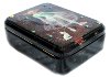 The lid is hinged from the left of the scene, and the box rests flat. The work is signed with the artist's name and the title on the box's reverse side.