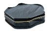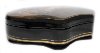 The box is made out of paper-mache. Black lacquer covers the exterior and red lacquer covers the interior of the box. The box has a hinge from the top of the scene, and rests on a wavy platform. The work is signed by the artist.