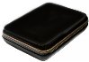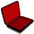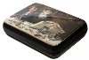 The box is constructed out of paper-mache. Black lacquer covers the exterior and red lacquer covers the interior of the box. The box has a hinge from the top of the painting, and rests flat. The box is signed with the artist's name.