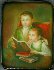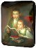 The composition is showing a Jewish Children at the table. The older Brother is teaching the younger one how to read.