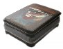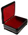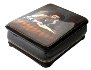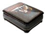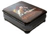 The box is constructed from paper-mache. Black lacquer is used to paint the exterior of the box while red lacquer completes the interior of the work. A hinge is fastened to the left of the portrait, and the box rests on four legs. The work is signed with the artist's name.