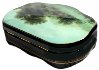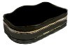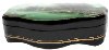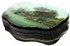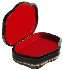 The box is made out of paper-mache. Black lacquer covers the exterior and red lacquer covers the interior of the box. The lid is hinged and the box rests on a platform with six legs.