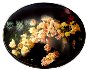 Description: This wonderful composition with roses was painted in Fedoskino. If we take a closer look, we can see that the roses are of different varieties and colors, and there are three bouquets in three vases!
