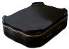 The box is constructed from paper-mache. Black lacquer is used to paint the exterior of the box while red lacquer completes the interior of the work. The lid is hinged from the top of the composition, and the box rests on four legs. The work is signed with the artist's name.