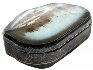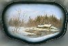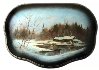 The scene is painted in grey and light blue oils suitable for reproduction of a depicted time of the year. A piece of mother-of-pear is set into the river to add glow and reflection on thin transparent ice.