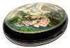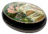 The box is made out of paper-mache. The lid is hinged from the top of the composition and the box rests flat. Signed with the name of the artist, the village of Fedoskino, and the year of 2011 at the bottom of the scene.