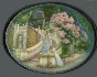 Description: This attractive composition was painted by a talented artist Yuriy Butsynsky of Fedoskino. It shows a beautiful lady going up the stairs surround a blossoming garden.