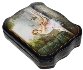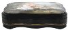 The box is constructed from paper-mache. Black lacquer is used to paint the exterior of the box while red lacquer completes the interior of the work. The painting is framed with a gold line. Two parallel gold lines are decorating the sides of the box.