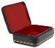 The box is constructed from paper-mache. Black lacquer is used to complete the exterior of the piece while red lacquer completes the interior of the box. The lid is hinged from the top and the box rests flat. The work is signed, titled and dated (2011) by the artist.