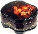 The box is made out of paper-mache. The edges of the lid and the sides are covered with skillfully painted gold patterns. For additional decoration, the sides are studded with tiny pink spots, it looks like veins on the stone.