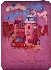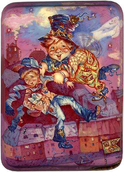 The box is painted in beautiful pinkish violet palette. Gold metal leaf is used for the most part to detail the costume of Carlson. Aluminum powder creates the light in the windows and outlines smoke coming out of chimneys.