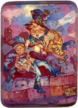 The box features a fragment from one of the most popular fairy-tales in Russia, "Carlson who lives on the roof" written by the Swedish writer Astrid Lindgren. On this fairy-tale the cartoon is based that is admired both by little children and their parents. The fairy-tale is about a boy and his family. He meets Carlson who happens to live on the roof in a little house. Karlson is a short, fat man with a propeller on his back and a button on his stomach to start the propeller. Carlson flies, smokes cigars, loves pastries and jam. Carlson of course gets the boy in lots of trouble with adults. A great read for kids from a young age!