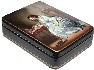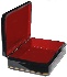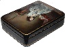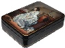 The box is made out of high quality paper-mache. Black lacquer covers the exterior and red lacquer covers the interior of the box. The portrait is framed with a gold line; two gold parallel lines wrap around the box's sides. The lid is hinged from the left of the portrait and the box rests on a flat bottom. The work is signed with the artist's name.