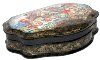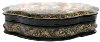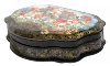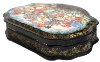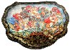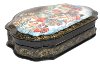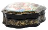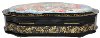 The composition is framed with a rich floral pattern painted in gold. The edges of a lid are odorned with a golden dot ornamentation. The sides of the box are also decorated with rich floral pattern painted in gold.