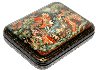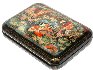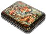 The box is made out of paper-mache. Black lacquer covers the exterior and red lacquer covers the interior of the box; clear lacquer is added in layers that are polished to a gleaming finish. Golden dot ornament frames the composition, while ornamentation wraps around the sides of the box with an expansive format and red accents. The box has a hinge above the composition and rests flat. Upon completing the work on this piece the artist writes the title, Kholui, and signs his name at the bottom of the composition. On the interior of the lid she also has signed and dated the box.