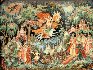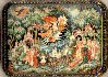 Veronika Veselova is a rising artist in Kholui, and is sure to be one of the masters in years to come. Her works already show a skill for both extremely small detail and small scenes, as well as an eye for design and layout on larger pieces such as this one. Egg-tempera paint is the main medium used to paint this composition. The palette is based in greens and reds that make complementary combinations throughout the scene. Three distinct periods of time are covered here with Ivan, Yelena, the Firebird, and the horse being the centerpieces. The two scenes flanking the central one are when the wolf, on two occasions, bails Ivan out of trouble with two angry Tsars. The action moves seamlessly across the scene with subtle transitions into each that are made by the landscape. Painting the sky green leaves a bold foundation for the rest of the colors in the composition to come alive under. Gold is used to highlight and detail a small portion of the total surface area of the composition, but its sparkle naturally enhances the great depth and epic mood set by the theme.