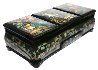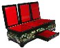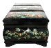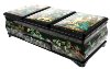 The chest is made out of paper-mache. Black lacquer covers the exterior and red lacquer covers the interior of the piece.