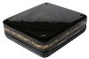 The box is constructed from paper-mache. Black lacquer is used to paint the exterior of the piece while red lacquer completes the interior of the work. The lid is hinged from the left of the composition, and the box rests on the four small round legs.