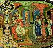 The inner setting of the throne room is richly detailed. It excellently reflects the style of Russian Medieval architecture. Looking at the costumes of the characters, the viewer can imagine what clothes Russian people wore at the times of Ivan the Terrible. The scene is painted in bright tempera paints and detailed with gold paints.