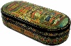 The scene is framed with a gold line, while the edges of the box are adorned with gold beads. The box's sides are decorated with luxuriant eastern patterns painted in gold paints, and accented with green, blue and red tempera paints.