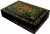 The box is constructed from paper-mache. Black lacquer is used to paint the exterior of the piece while red lacquer completes the interior of the work. The lid isn't hinged and the box rests on a small platform. On the lid's interior the artist wrote in gold the title of the piece, "Russian Expanses", the village of Mstera, and her original signature. Just near this inscription the beautiful floral pattern is painted in gold and aluminum.