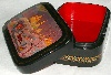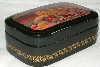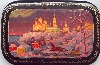 The box is constructed out of paper-mache. Black lacquer covers the exterior and red lacquer covers the interior of the box. The lid isn't hinged, and the box rests on a flat bottom. The work is signed with Mstera, the title (“Ancient Vladimir”), the year of 2002 and the artist's name.