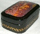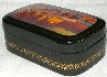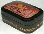 The scene is outlined with gold. The edges of the lid and the box's sides are adorned with intricate gold patterns. On the box's sides these patterns are accented with green, red, yellow and lilac tempera paints.