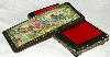 The box is made out of paper-mache. Black lacquer covers the exterior and red lacquer covers the interior of the box. Gold ornamentation frames the