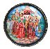 Here we can see Gvidon's island with all its wonders: the squirrel that all day long shells golden nuts, separating gold nutshells from emerald kernel of nuts, the thirty-three knights with their uncle old Chernomor, rising from the raging sea, and, the beautiful Princess Swan. On the lid of the box the artist depicts reunion of the family.