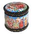 The box is constructed from paper-mache. Black lacquer is used to paint the exterior of the box while red lacquer completes the interior of the work. The lid is not hinged and the box rests flat. The work is signed with the artist's name, title and the village of Mstera on the buttom of the exterior of the box.
