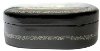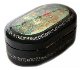 the painting is framed with a aluminum line. The edges of the lid are decorated with elaborate aluminum patter; the sides of the box are adorned with a foliage painted in aluminum too.