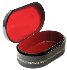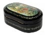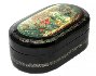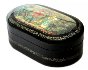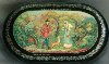The box is constructed from paper-mache. Black lacquer is used to paint the exterior of the piece while a radiant red lacquer completes the interior of the box. The lid is hinged from the top of the scene and the box rests flat. The work is signed with the artist's name, Mstera (under the painting) , and title (above the painting).