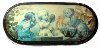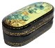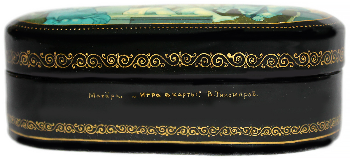The scene is framed with a gold line, the edges of a lid are decorated with gold dot ornament.The sides of the lid and the box's sides are adorned with gold ornamentation.