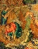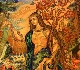 The palette is based in rich greens, oranges and browns. Gold paint is used abundantly to add detail and outline certain features in the scene. The best example of the usage of gold is the creation of animals' hair. Vividly creative.
