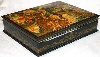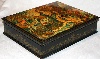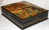 The box is constructed from paper-mache. Black lacquer is used to paint the exterior of the box while dark red lacquer completes the interior of the work. The edges of the lid and the box's sides are decorated with rich gold ornamentation. The lid is hinged from the top of the composition, and the box rests on four feet. The artist wrote his name, the title ("Morning"), the year of 2004 and the village name of Mstera at the bottom of the composition using gold metal paint.
