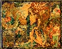 Description: This intriguing composition was composed by the talented Viktor Kuznetsov of Mstera. Well orchestrated colors develop the surrealistic imagery within. A potent palette of powerful radiance. A dream -like combination of passionate design and finely executed animation. Theme is unique and interesting. Here the artist creates the allegorical depiction of the Morning. He paints him as young handsome lad dressed in the robe made out of wheat ears and wild flowers. His body emanates bright golden light, and with each his step the darkness of a night disappears. The new day is beginning, and the peasants start to fulfill their daily routine. They pasture cattle, feed domestic animals and birds, mow off wheat, nurse little children and gather hay.