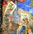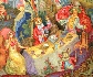 The palette is very bright and filled with oranges, reds, greens and blues. Gold paint is used to add detail and highlight areas of importance in the scene. The gold is lightly applied throughout the entire scene, but most impressive is the way he depicts the ornaments that decorate Alice's dress. With fine brushwork, Golovanov has created vivid detail on the faces of the various characters, both people and animals.