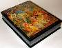 The box is constructed from paper-mache. Black lacquer was used to paint the exterior of the piece while a brilliant red lacquer completes the interior of the box. A hinge is fastened to the left of the composition, and the box rests on four legs. Golovanov signed and titled his work on exterior bottom of the box in gold paints.