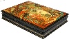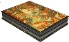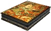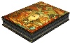 This box also features this medieval subject focusing the viewer's attention on the virgin reading a book and two unicorns. In the right upper and left bottom corners another sacred animals, the lion and the deer, are depicted. In the left upper corner the artist paints the tsar drinking from the magic horn of unicorn. It was considered that a horn of unicorn could remove any poison from the liquid and also could make a man healthy.