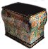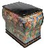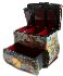 The box is constructed from paper-mache. Black lacquer is used to paint the exterior of the piece while red lacquer completes the interior of the box. The box has one large lid and 3 other compartments over it, each of them has own lid with a hinge. There is a large drawer compartment in a base.