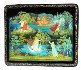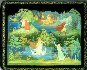 The work is a good example of intricate Palekh art. The green and blue tones are predominated here, the reds and oranges passionate. Hair thin gold and silver accents have been used extensively throughout the composition adding rich luminescence and delicacy to the piece. The Snowmaiden's figure is painted to look transparent to remind the fact that she is the daughter of nature.
