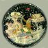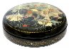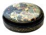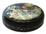 Description: This round box that shows a scene from the popular Russian fairy-tale "By the Pike's Will" or "Emelya and the Magic Pike" was painted by Palekh artist, Gagarina Olga.